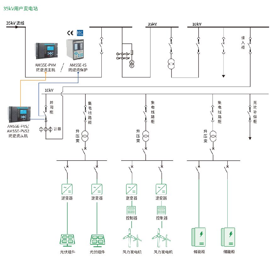 大多数中小型分布式项目 ,逆流监测点和并网柜之间的距离在100米以内,用AM5SE-IS 单机版防逆流保护装置方案,该装置针对单一监测点,最多5段低功率跳闸功能,响应速度快,支持35kV、10kV 及低压 380V 多种电压等级。