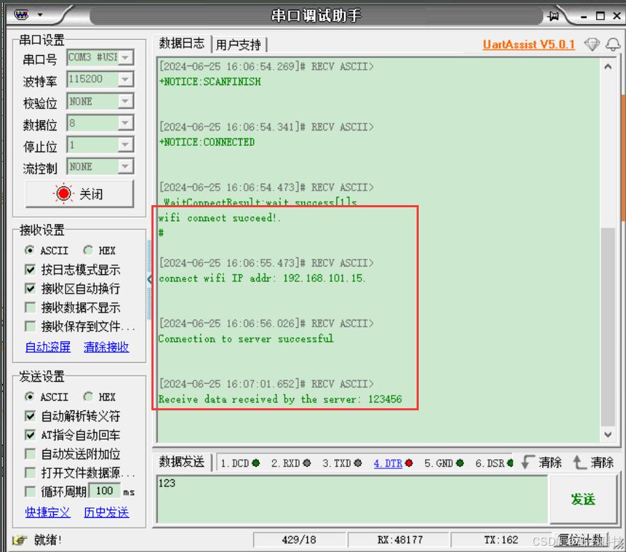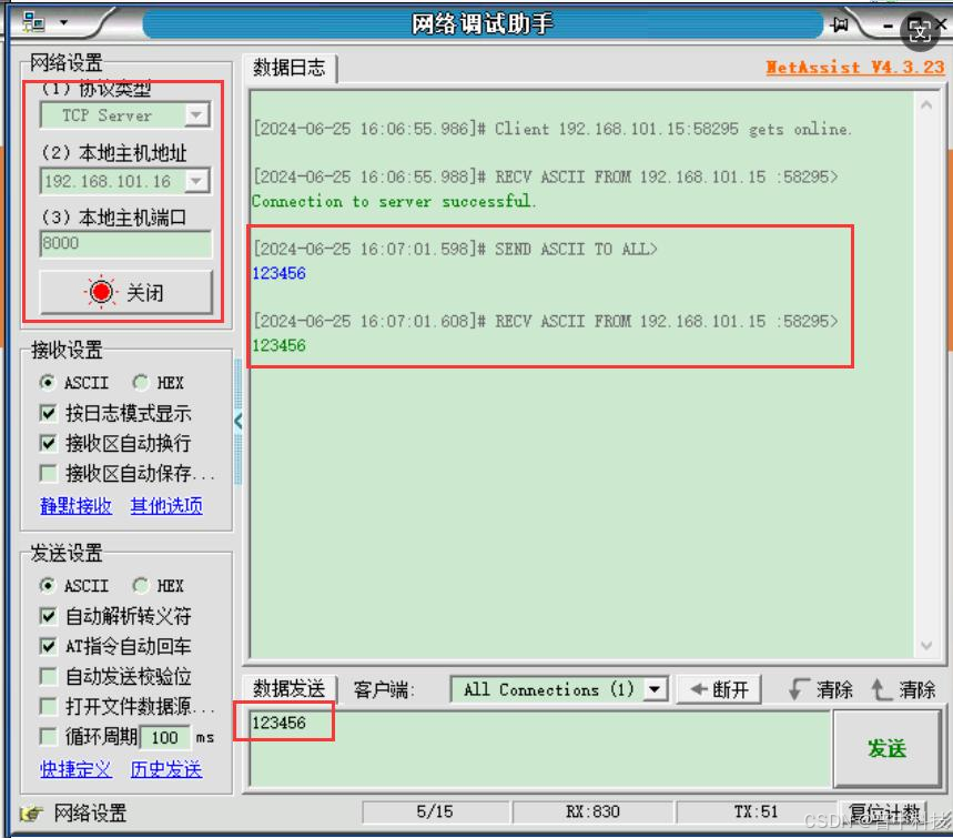 连接路由器热点, 打开网络调试助手, 选择 TCP 协议连接, 即可与开发板进行 TCP 通信, 开发板作为客户端, 电脑作为服务端。