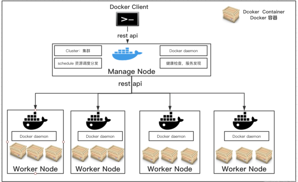 上图可以看出,Swarm 是典型的 master-slave 结构,通过发现服务来选举 manager。manager 是中心管理节点,各个 node 上运行 agent 接受 manager 的统一管理,集群会自动通过 Raft 协议分布式选举出 manager 节点,无需额外的发现服务支持,避免了单点的瓶颈问题,同时也内置了 DNS 的负载均衡和对外部负载均衡机制的集成支持。