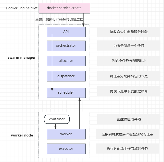 - API:这个请求直接由Swarm manager的API进行接收,接收命令并创建服务对象。