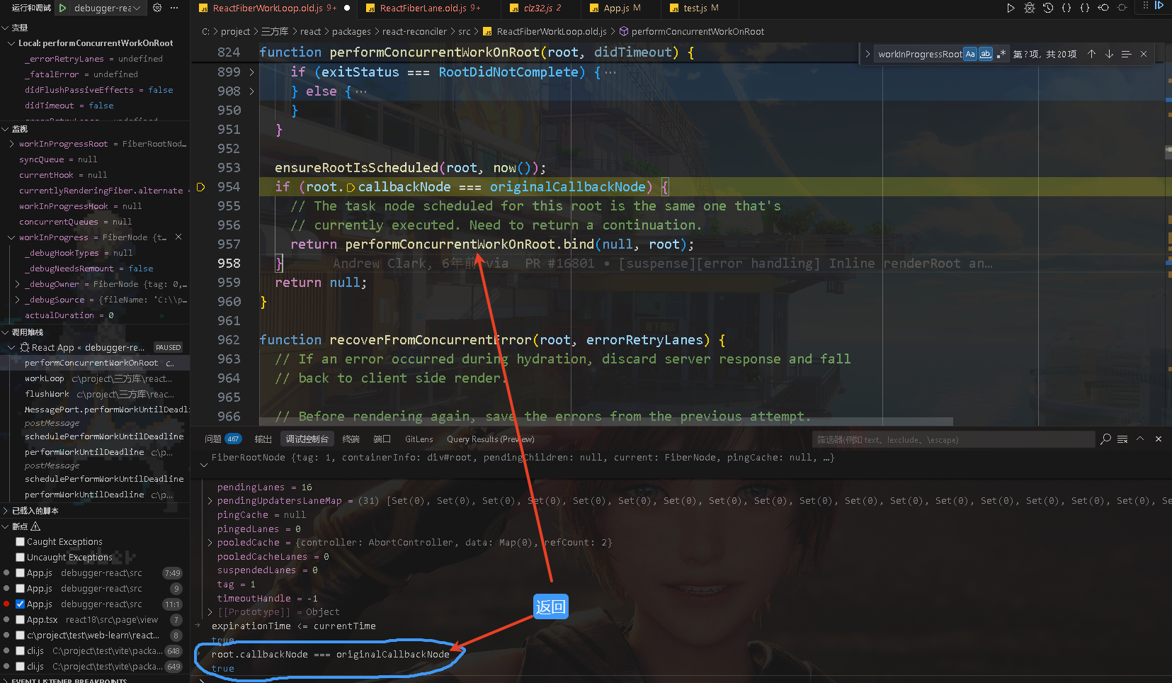 从入口部分粘贴的代码部分中可以看到performConcurrentWorkOnRoot函数即为终端重启调用栈的开始,这里的返回为下一次的开启创造了函数执行的条件