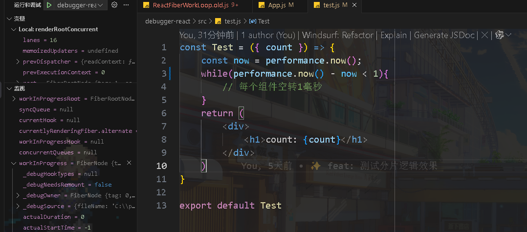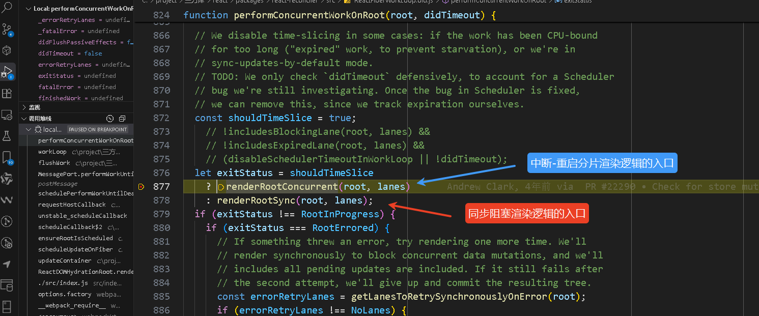 前言的文章即是按照同步阻塞渲染逻辑来debugger的。中断-重启分片渲染逻辑与阻塞渲染逻辑分道扬镳始于这个判断(因本人不知道如何才能让react自动走到这个判断上来,索性debugger的时候直接把shouldTimeSlice改成true了)
