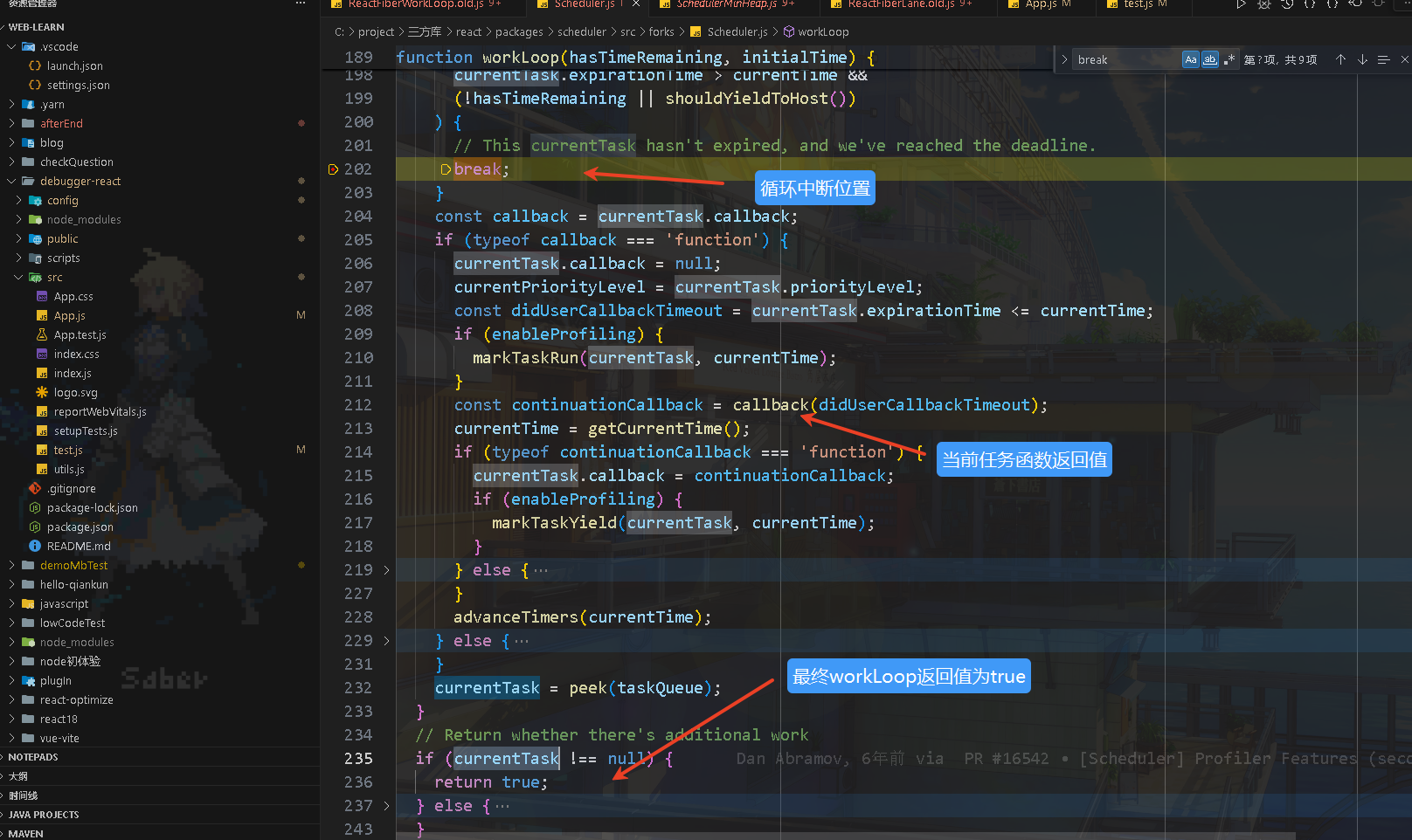 此时函数栈弹出到workLoop函数中,并将continuationCallback赋值成上面返回的函数,最后赋值给currentTask.callback,并在下一次的while循环通过shouldYieldToHost()进行循环的跳出