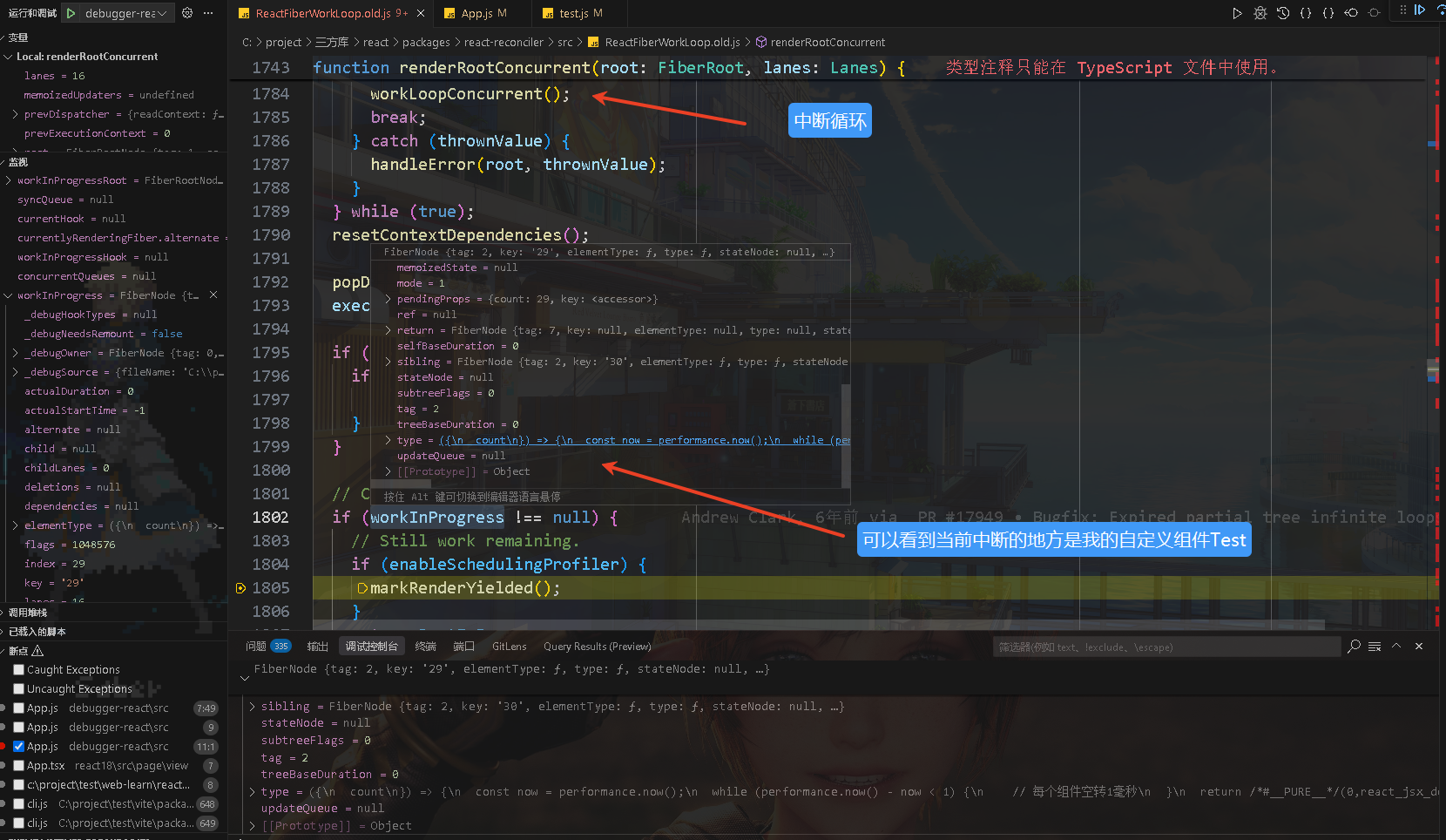 通过控制shouldYield函数返回true来跳出workLoopConcurrent的while循环,进而进入为之后重启做准备的逻辑。