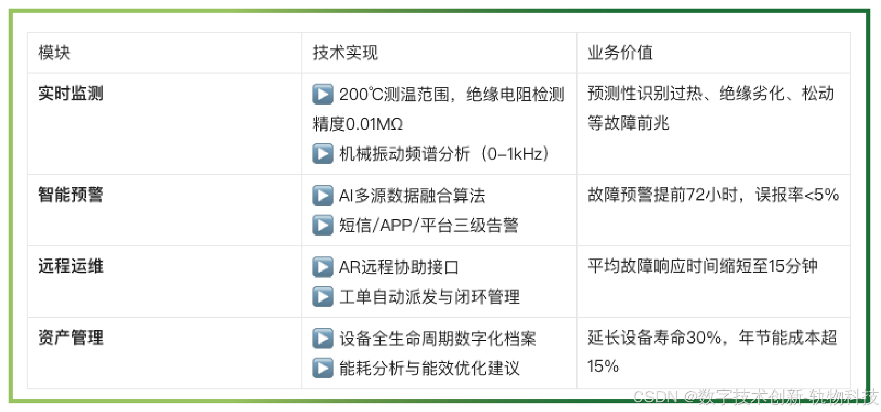 ◆ 联合诊断系统 :通过AI算法整合温度、湿度、振动、电流负载 等多源数据,建立故障关联模型,实现"设备-环境-风险"联动预警。