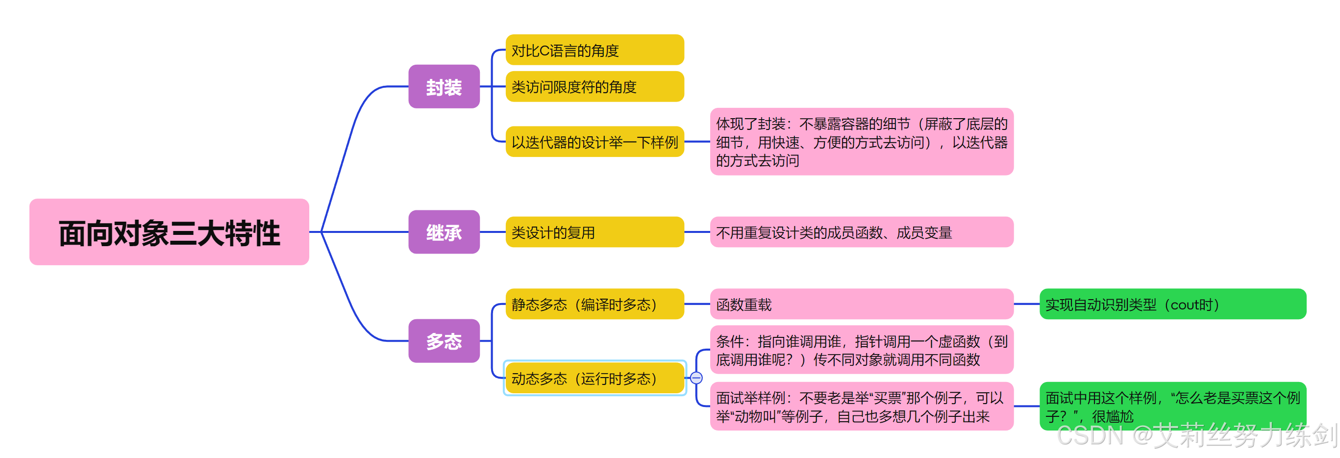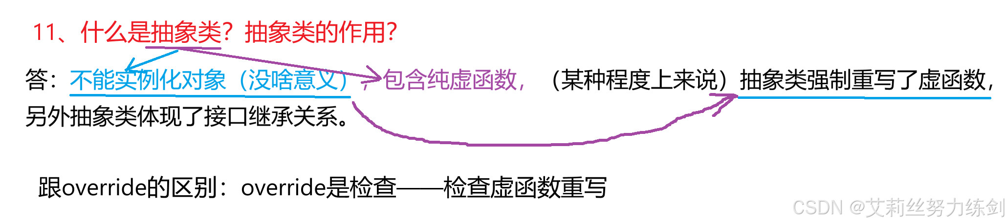 **答:**不能实例化对象(没啥意义),包含纯虚函数,(某种程度上来说)抽象类强制重写了虚函数,另外抽象类体现了接口继承关系。
