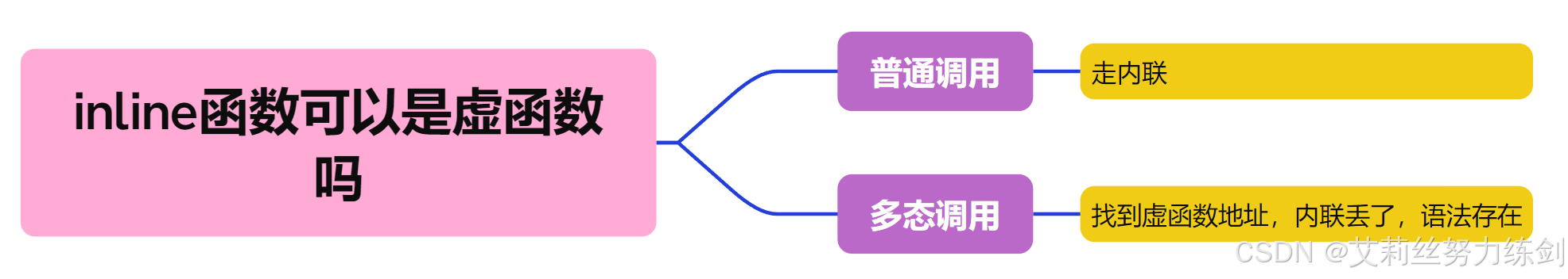 语法上不报错,但是至少说明作为多态调用时到虚表里去找的时候,inline函数的内联属性就丢了------正常函数的调用是call地址,跳转过去调用;内联的特点:跳转过去调用,要建立栈帧,内联就不需要地址,因为内联就是调用那个符合内联属性的函数把内联展开,(当然要符合内联要求:内联要求比较短小)所以没有地址,如果这个是虚函数,虚函数必然是要有地址放进虚表里去走------如果要走多态这条路径调用的话,必然是call一个地址,找到虚表里面------看前面多态,"指向谁调用谁"------虚函数还能是内联吗?因此两个属性不能同时存在。
