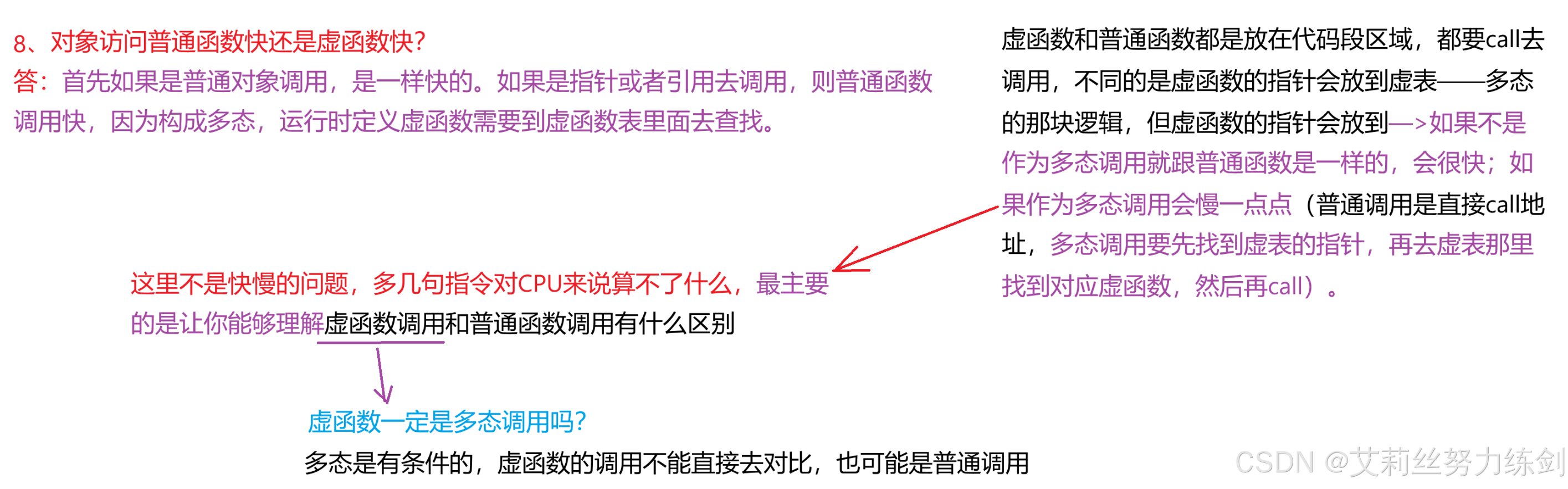 虚函数和普通函数都是放在代码段区域,都要call去调用,不同的是虚函数的指针会放到虚表------多态的那块逻辑,但虚函数的指针会放到**~>如果不是作为多态调用就跟普通函数是一样的**,会很快;如果作为多态调用会慢一点点(普通调用是直接call地址,多态调用要先找到虚表的指针,再去虚表那里找到对应虚函数,然后再call)。