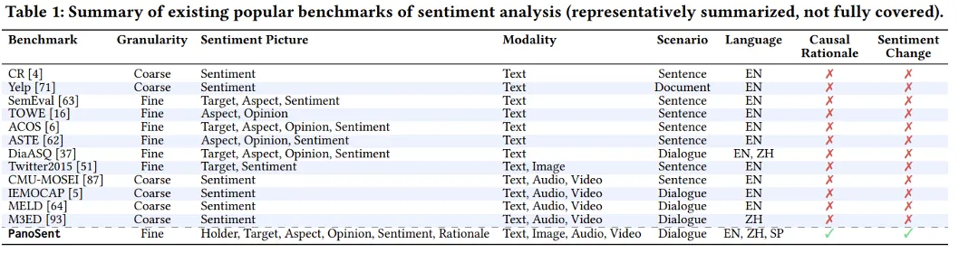 新加坡国立大学联合武汉大学、奥克兰大学、新加坡科技设计大学、南洋理工大学团队近期在这个方向上迈出了重要的一步,探索了情感分析的终极形态,提出了 PanoSent ------ 一个全景式细粒度多模态对话情感分析基准。PanoSent 覆盖了全面的细粒度、多模态、丰富场景和认知导向的情感分析任务,将为情感计算方向开辟新的篇章,并引领未来的研究方向。该工作被 ACM MM 2024 录用为 Oral paper。