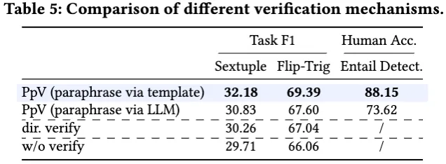 作者验证了基于复述的验证机制(PpV)的有效性。实验表明,通过 LLM 复述和直接验证,PpV 机制能够确保结构化数据与对话上下文之间的语义一致性,其性能优于仅依赖直接验证或不进行验证的方式。此外,使用固定模板复述结构化元组比依赖 LLM 复述更为可靠,这进一步增强了情感分析的稳健性。