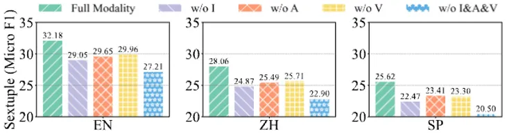研究团队深入分析了多模态信息在情感分析中的作用,发现其不仅是对文本信息的补充,还在六元组元素的判断中起到关键作用。实验结果显示,移除任何模态信号都会导致性能下降,尤其是图像信息的缺失对性能的影响最大。这表明,多模态信息在任务中不可或缺,对提高模型的识别精度至关重要。