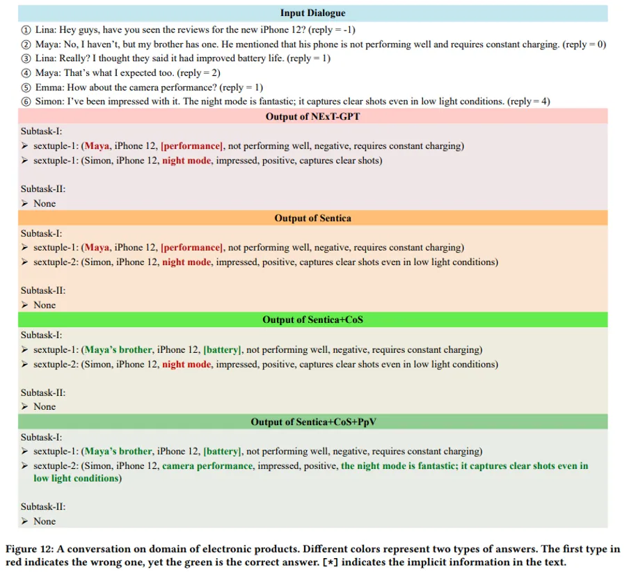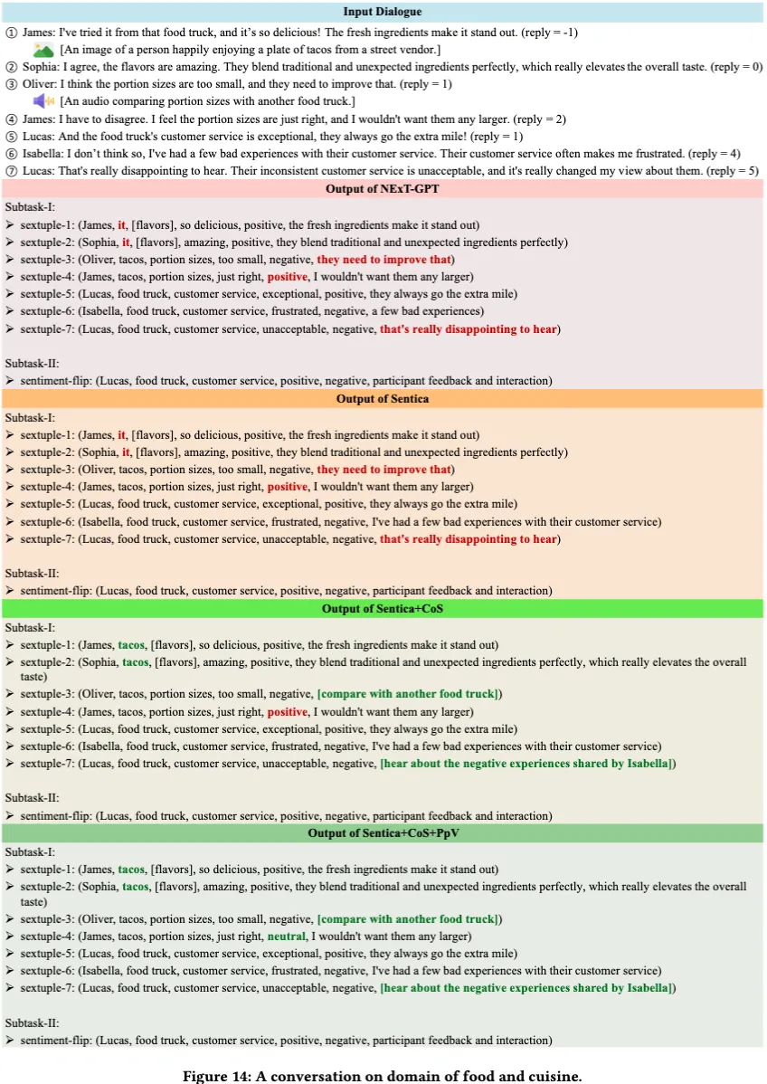 作者通过多个实例展示了所提出模型在与其他模型对比中的优越性能。如图 12-14 所示,该模型展现了对复杂对话上下文的更深入理解,能够精准捕捉对话中的微妙细节,并推断出隐含意图。得益于卓越的多模态信息处理能力,该模型能够更准确地解释各种模态信号。此外,该模型在识别对话中隐含元素方面表现突出。这些优势使模型能够更全面地提取六元组信息,并更准确地分析对话中的情感翻转。