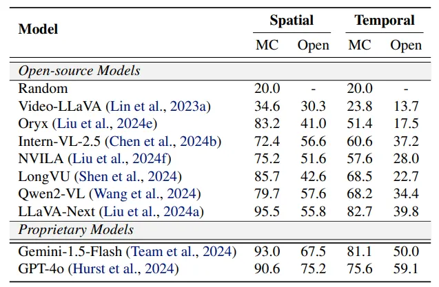 - 现有模型在时域动态推理方面仍存在不足。模型在时域任务上的性能显著低于在空域任务上的性能。