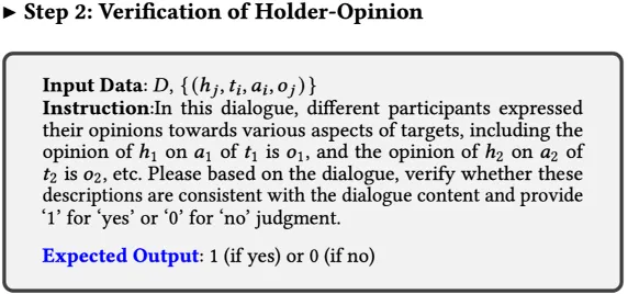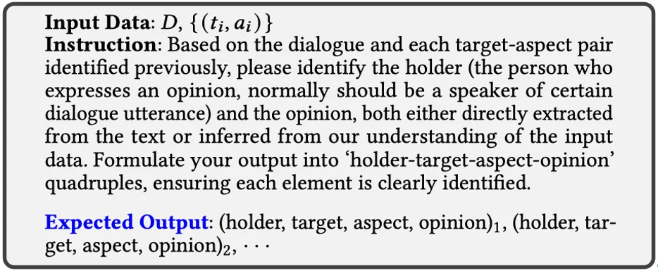 在识别出 "目标 - 方面" 对之后,下一步是检测相关的持有者及其具体观点。输出应为包含持有者、目标、方面和观点的四元组,为后续的情感分析奠定基础。