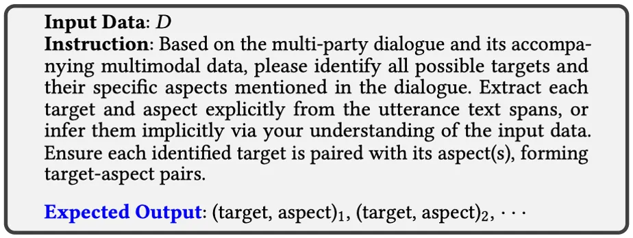 在给定对话文本及其多模态信号下,通过特定指令,要求模型识别对话中提到的所有可能的目标及其对应的方面,形成目标 - 方面对。