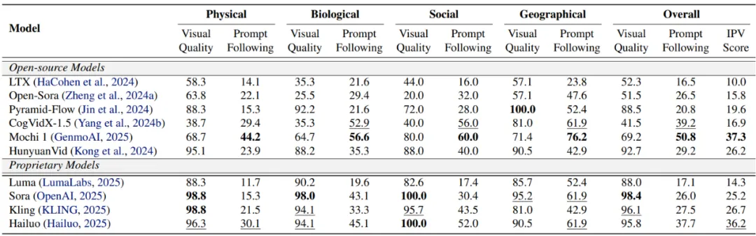 - 模型在视频质量以及提示遵循两方面能力不均衡。商业模型在视觉质量上遥遥领先,但是难以严格遵循文本提示生成 "不可能" 事件。开源模型如 Mochi 1 视觉质量虽然逊色,但是提示遵循能力远强于闭源模型。