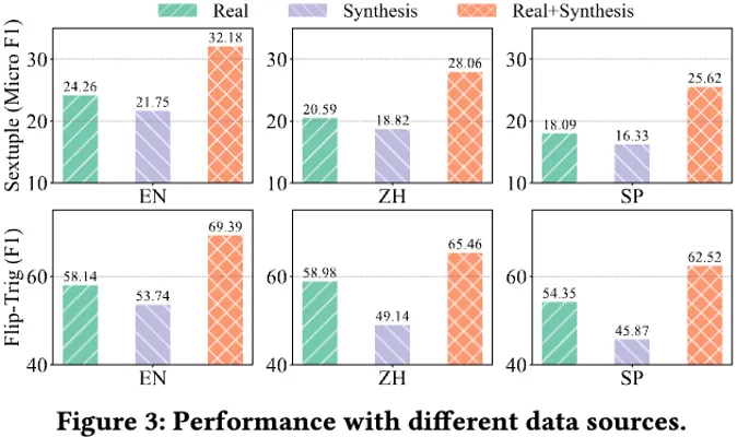 实验结果表明,尽管合成数据量较大,模型在真实数据上的训练效果更佳。这是因为真实数据的信息分布更为自然,帮助模型学习到更具代表性的特征。然而,合成数据作为补充则显著提升了模型的最终性能,进一步证明了合成数据在优化模型表现中的关键作用。因此,构建合成数据不仅是必要的,而且有助于提升情感分析的整体效果。