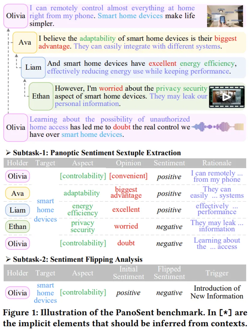 - 全景式情感六元组抽取:从多轮、多方、多模态对话中识别情感持有者、目标、方面、观点、情感及其原因。