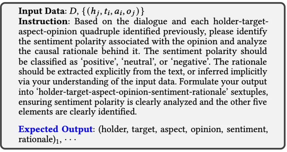 基于已识别的四元组,分析与每个观点相关的情感并识别其背后的理由。最终输出为六元组,全面展现情感表达及其背后的因果逻辑。