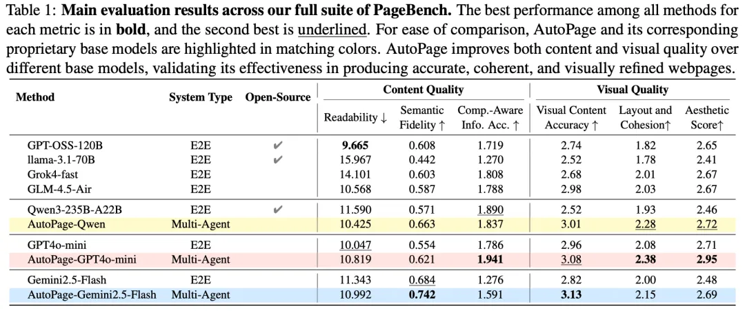 我们收集了超过1500个学术主页作为模版提供用户任意选取使用,并且通过聚类挑选了接近100个风格差异较大的模版构建评测基准 PageBench 。自此基础上,我们系统评估了 本文提出的AutoPage 的表现,结果表明: