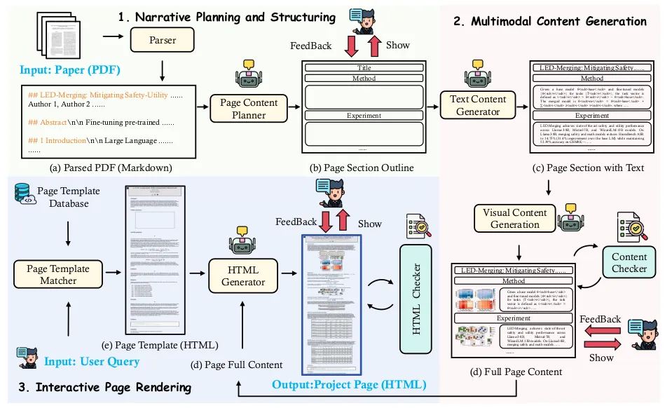 为了破解这一难题,研究者们提出了 **AutoPage,**一个将学术论文一键转化为高质量、交互式项目主页的多智能体协作框架。它就像一个专业团队一样,自动解析论文、生成内容、设计排版,让学术论文网页自动化,快速,低成本的生成。