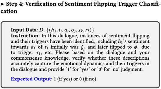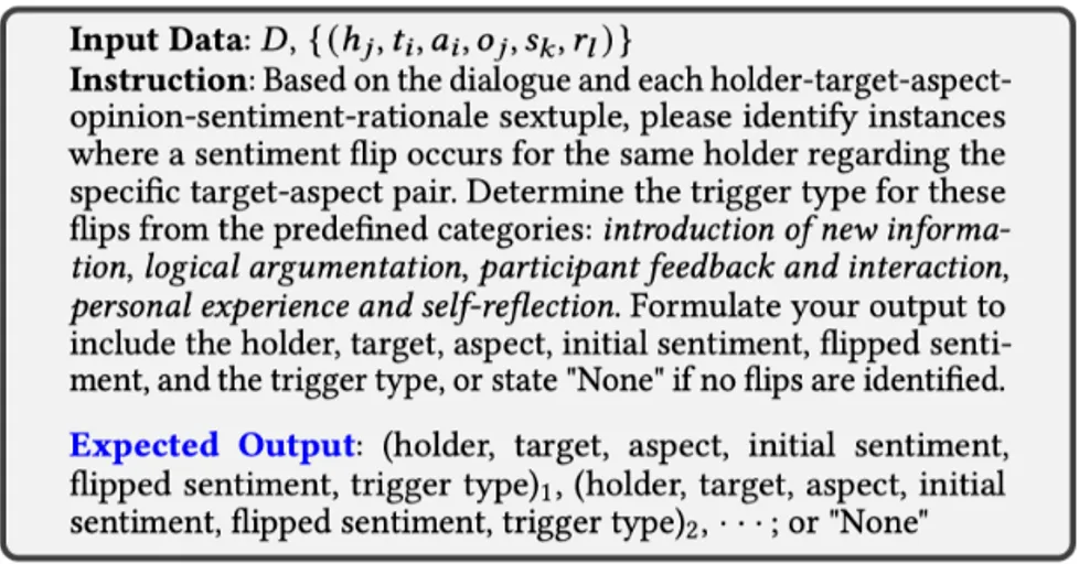 在识别出所有六元组后,最后一步是检测情感的翻转,即从初始情感到翻转情感的变化,对导致情感翻转的触发因素进行分类。输出应为包含上述情感元素的六元组或 "None" (如果没有情感翻转)