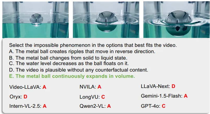 - 现有模型展示出了对 "不可能" 事件一定程度的理解能力。在 "不可能" 事件识别任务(MC)中,现有模型在区分选项中的不可能事件和其他事件方面展示了较大的潜力。然而,在没有选项线索的开放描述任务中(Open),模型从视频中直接推理并解释" 不可能" 事件仍旧困难。