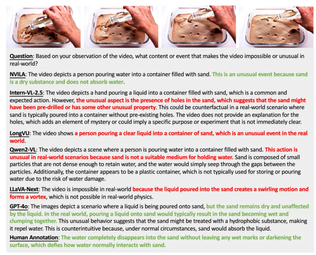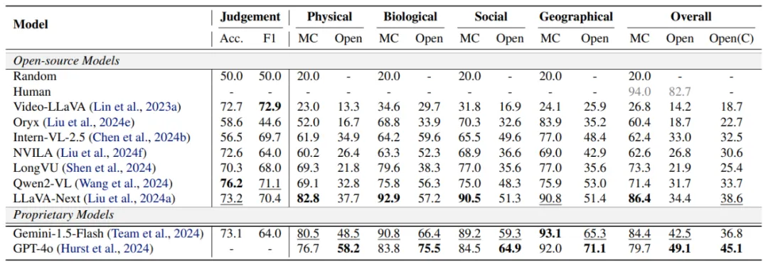 - 物理规律类视频的理解更具挑战、生物、社会、地理类的视频理解相对容易。