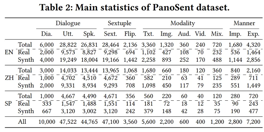 为确保基准的通用性,数据集包括三种主流语言:英语、中文和西班牙语。作者从现实世界来源收集数据,进行了精心的手动标注。为了扩大数据集的规模,作者进一步利用 OpenAI GPT-4 自动生成数据,并结合多模态检索技术进行扩展。严格的人工检查和交叉验证确保了高质量标准。PanoSent 总共覆盖了 10,000 个对话。表 1 对 PanoSent 与现有的一些多模态细粒度情感分析数据集进行了对比分析。