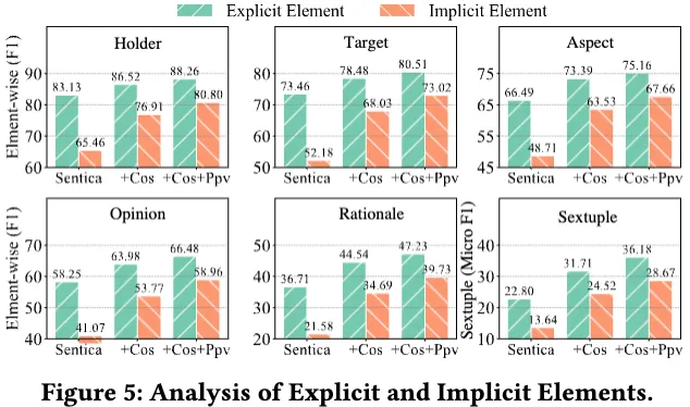 通过对显性与隐性情感元素的识别性能进行对比分析,结果显示,隐性元素的识别难度明显高于显性元素。这反映了识别隐性元素对上下文语义理解的更高要求,进一步说明在情感分析中,应特别关注对隐性元素的识别和处理。