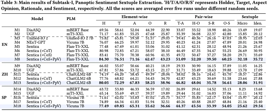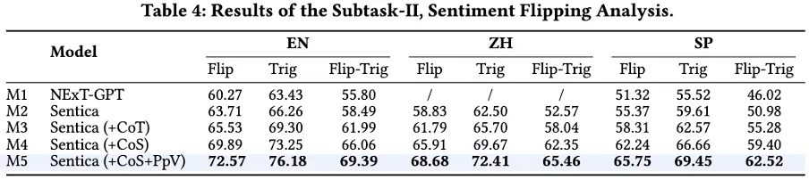 团队通过实验验证了 Sentica 在两个子任务中的表现。在六元组抽取任务中,Sentica 显著优于其他方法,尤其是在结合 CoS 和 PpV 机制后,表现达到最佳。在情感翻转分析中,Sentica 同样表现出色,特别是在多语言环境下,准确性显著提高。