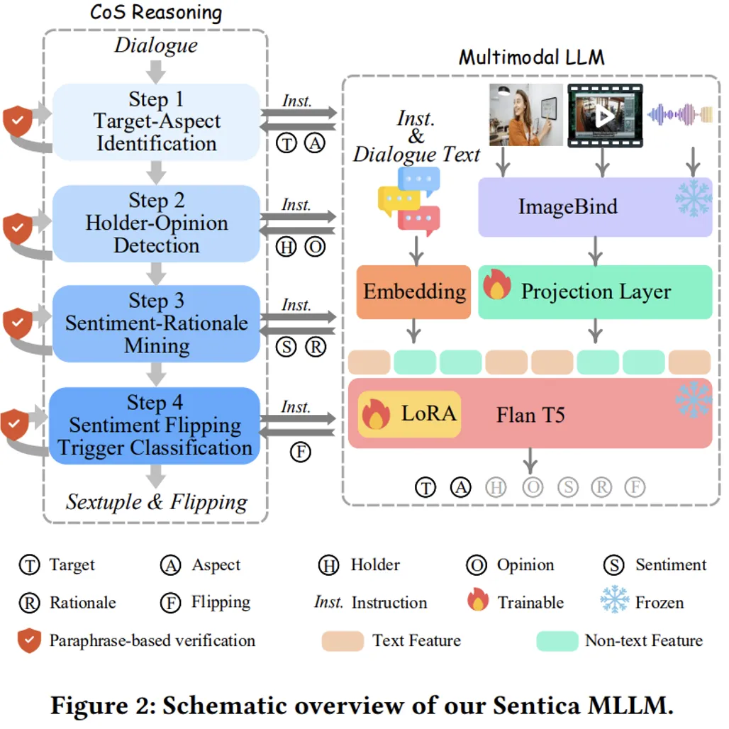 与现有的 ABSA 任务相比,本文提出的新任务提出了更大的挑战,例如需要理解复杂的对话情境并灵活地从各种模态中提取特征,尤其是在认知层面识别因果原因。考虑到多模态大型语言模型(MLLMs)在跨多模态的强大语义理解方面最近取得的巨大成功,作者构建了一个主干 MLLM 系统,Sentica,用于编码和理解多模态对话内容。受人类情感分析过程的启发,作者进一步开发了一个情感链推理框架(CoS),用于高效地解决任务,该框架基于思维链的思想,将任务分解为从简单到复杂的四个渐进推理步骤。该系统能够更有效地提取情感六元组的元素,并逐步识别情感翻转,同时引导出相应的理由和触发因素。基于释义的验证(PpV)机制增强了 CoS 推理过程的稳固性。