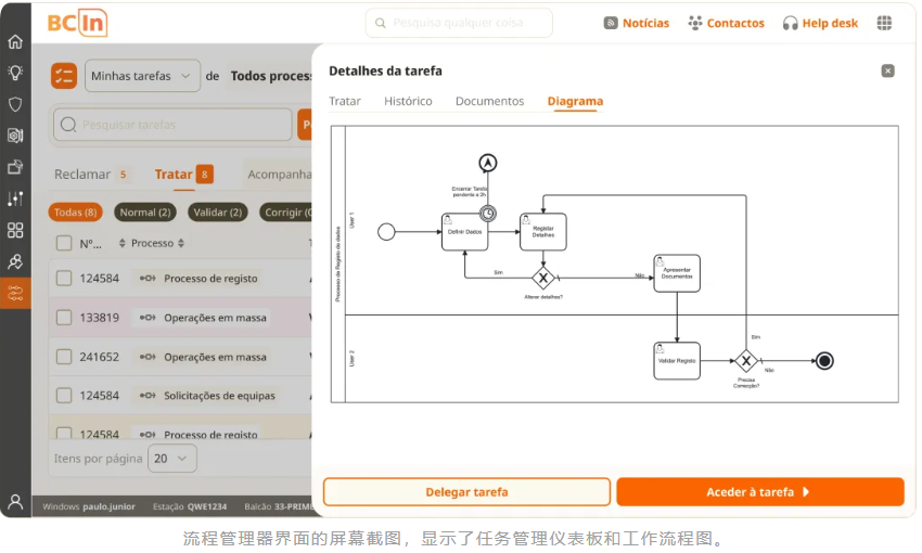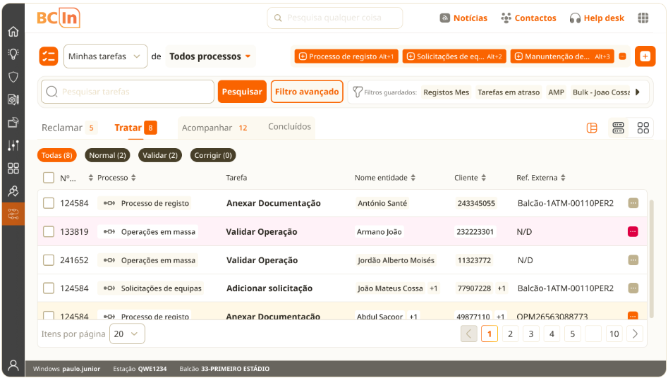 流程管理器任务管理界面的屏幕截图,显示"Tratar"(待处理)选项卡下的活动任务列表视图。