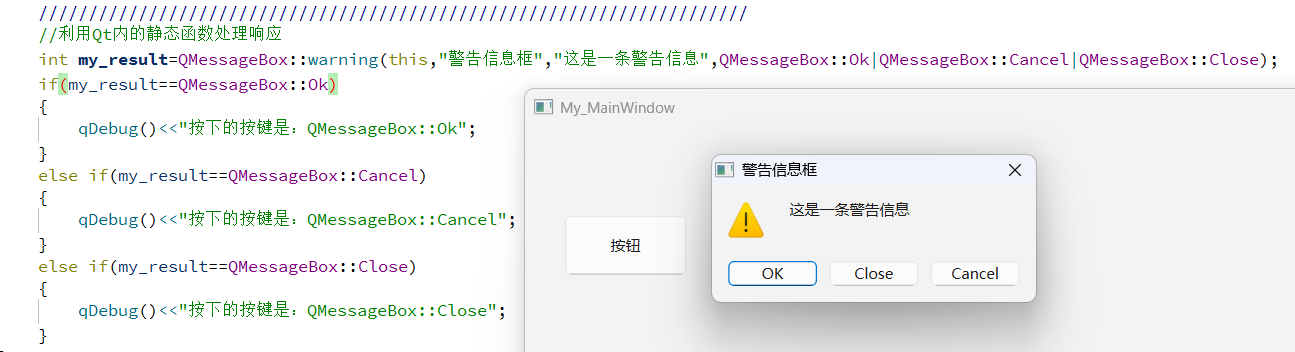 以上就是对于Qt内置按钮的两种响应处理方式,同时,在QMessageBox信息框中,不仅仅有内置按钮,我们也可以自定义按钮,具体如下所示: