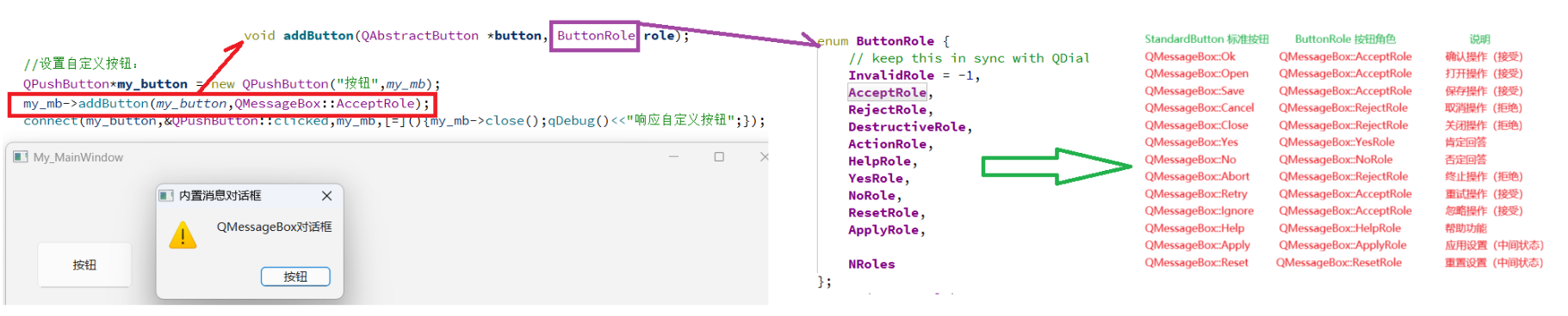 在 Qt 的 QMessageBox 中,StandardButton(标准按钮)与 ButtonRole(按钮角色)存在默认的一一对应关系,这种对应关系决定了按钮的交互逻辑(如默认焦点、回车 / ESC 响应等)。Qt 内部会默认维护这一对应关系,例如 Ok 按钮默认关联 AcceptRole,点击后会触发对话框的 "接受" 逻辑;Cancel 按钮关联 RejectRole,点击后则触发 "拒绝" 逻辑,无需手动指定即可生效。同时,还可以通过 connect 函数对按钮点击进行响应,绑定回调函数,从而实现对自定义按钮的处理。