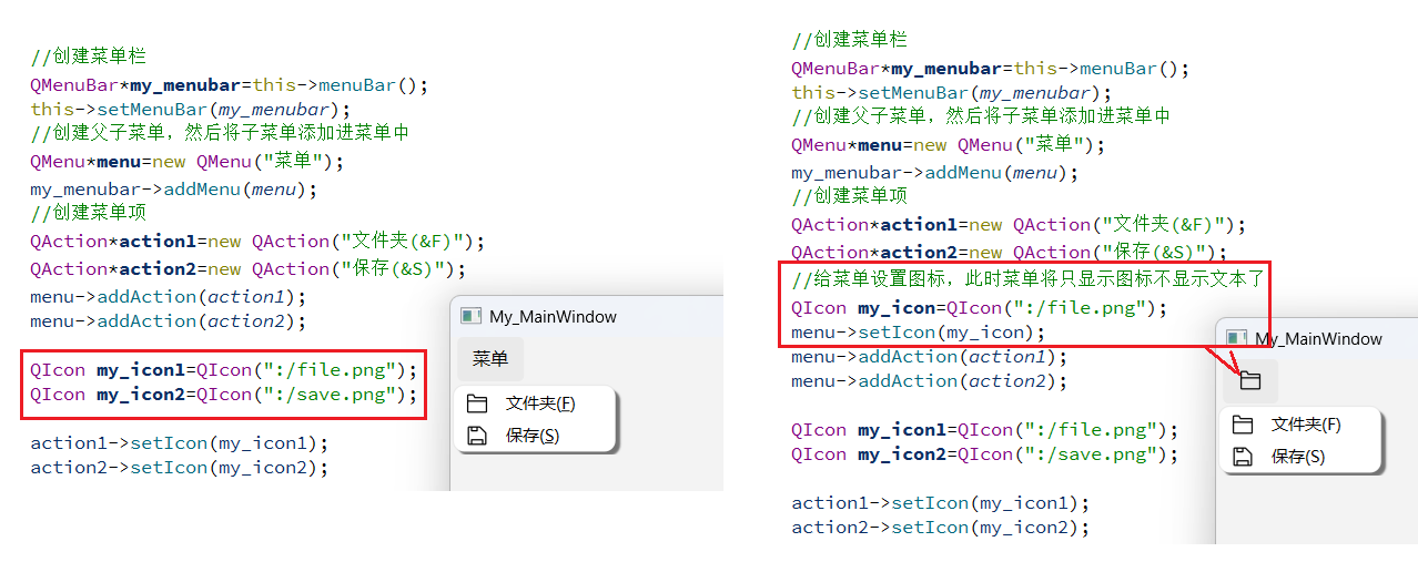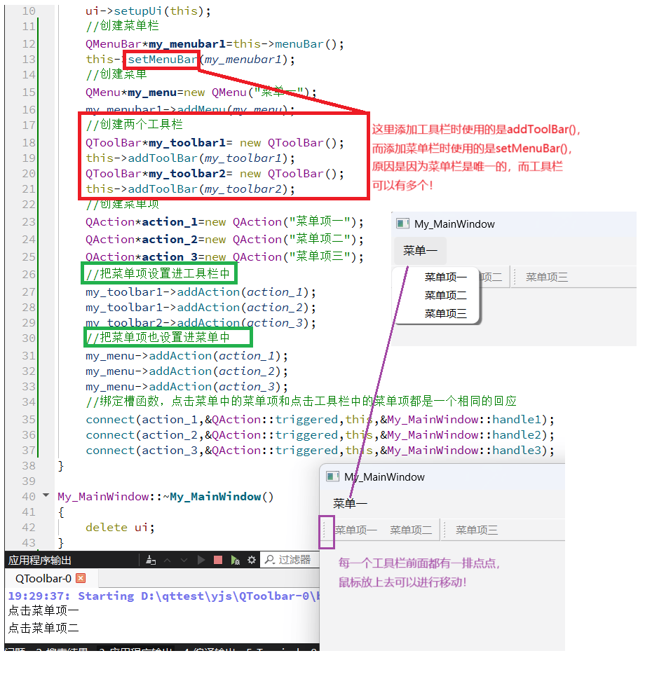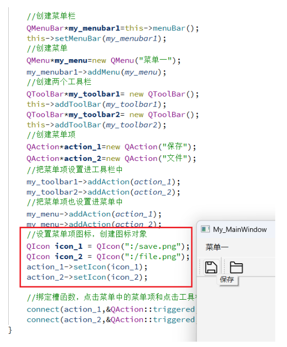 如上所示,以上便是工具栏的基本创建与使用方法。在 Qt 中,菜单栏通过 setMenuBar 方法添加,一个应用程序只能有一个菜单栏,若重复设置,新的菜单栏会替换旧的;而工具栏通过 addToolBar 方法添加,支持存在多个,重复设置时会新增工具栏而非替换已有。此外,菜单项 QAction 既可以添加到菜单中,也能添加到工具栏里,点击时它们会绑定同一个槽函数,产生相同的响应效果。同时,每个工具栏前都带有标识符,将鼠标放在上面即可拖拽,以此设置其停靠位置或使其成为浮动窗口。不仅如此,工具栏中的菜单项我们也可以为其设置图标,具体如下所示: