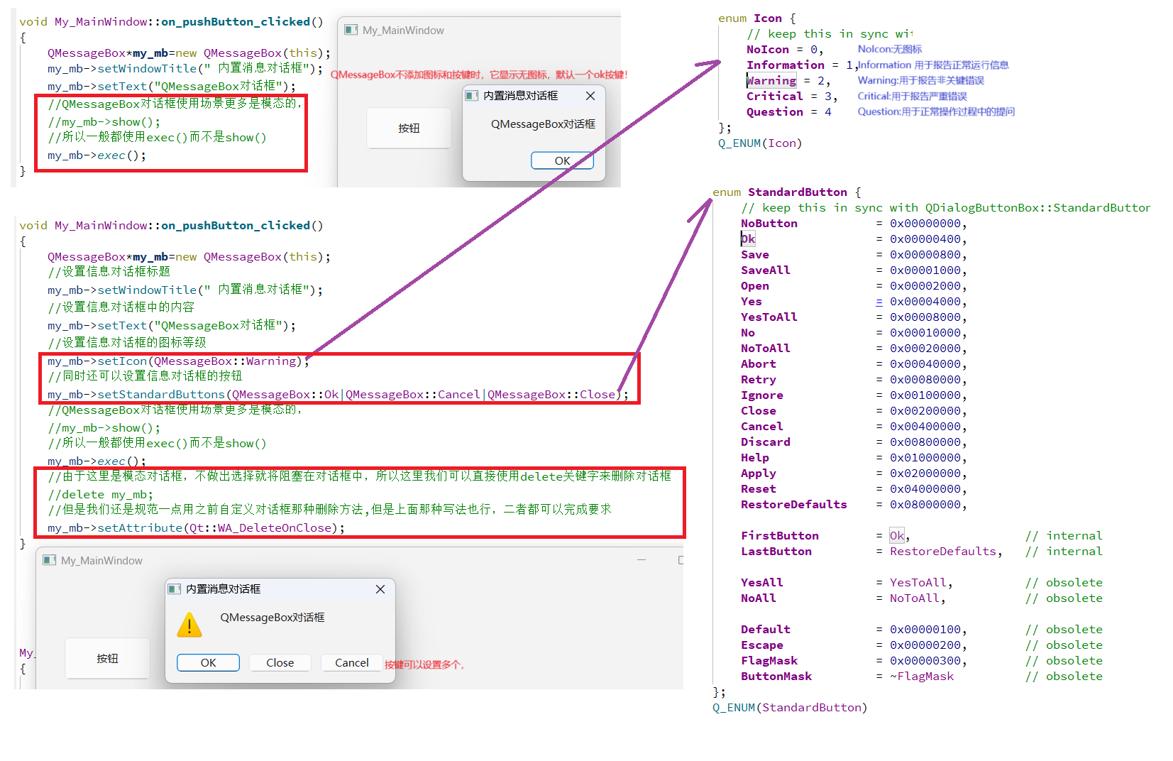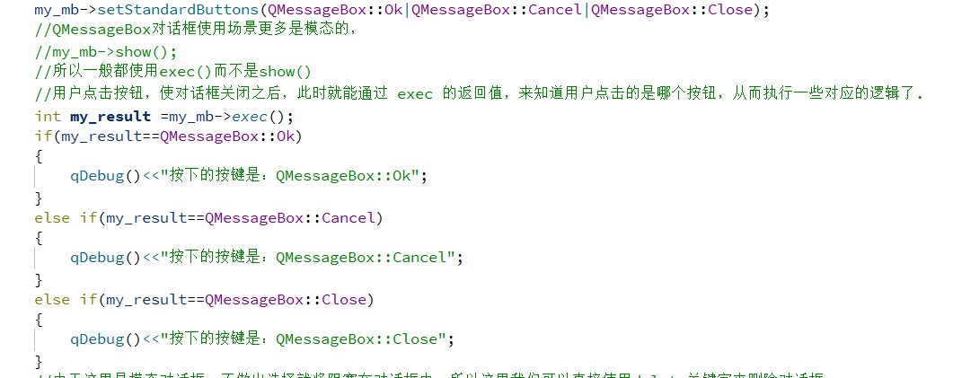 //QMessageBox对话框使用场景更多是模态的,