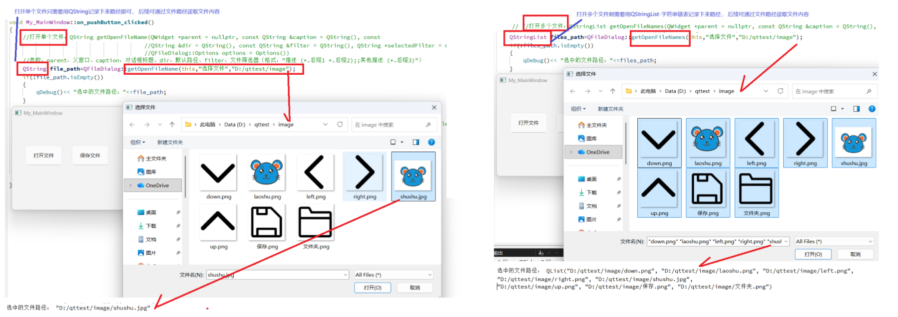 在 Qt 中使用 QFileDialog(文件对话框)主要有两种方式,分别适用于简单场景和复杂自定义需求:对于简单场景,可通过 QFileDialog 提供的多个静态方法快速调用,直接弹出文件对话框并返回用户选择的文件 / 目录路径,无需手动实例化对象;而如果需要更灵活的设置(如自定义按钮、修改对话框样式、实时监听选择变化等),则可实例化 QFileDialog 对象。上面介绍的是直接使用静态方法快速调用的方式,同时这里只展示了打开单个及多个文件的操作,至于保存单个或多个文件、选择目录等更多操作,可参考 Qt 手册深入学习,这里不再一一介绍。