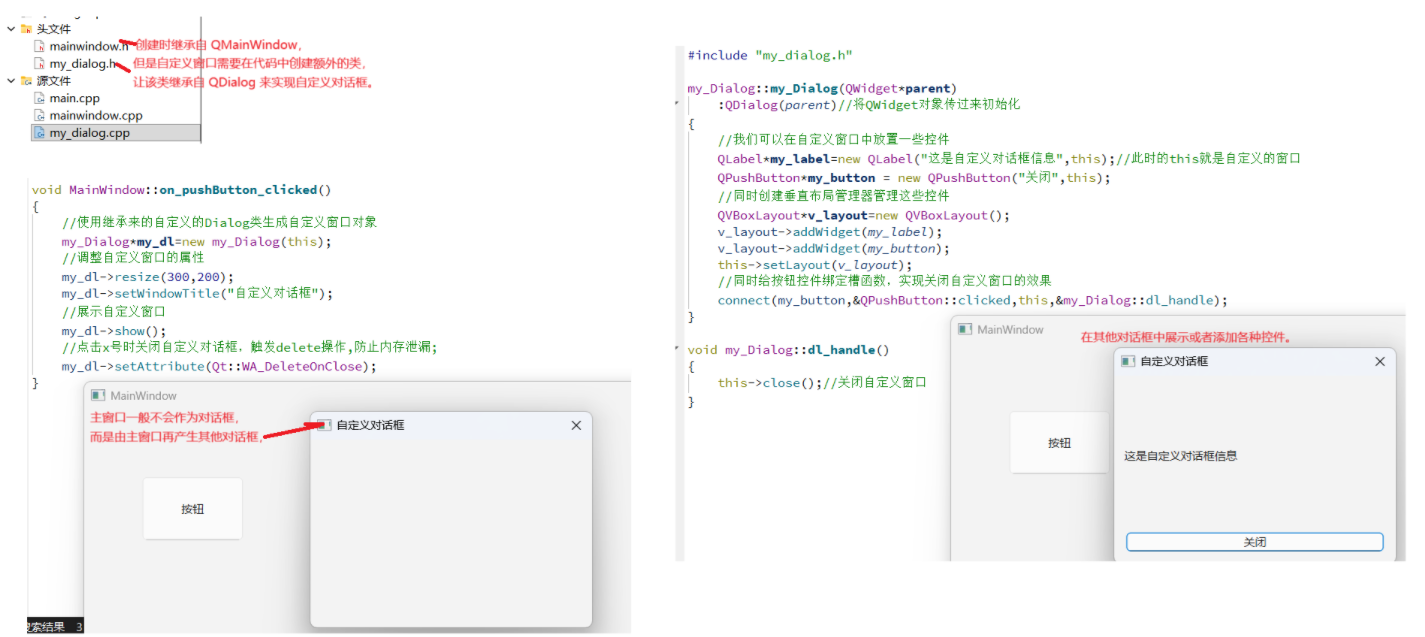 如上所述,使用自定义对话框时,我们会新建一个继承自 QDialog 的 C++ 文件,此时 Qt 会自动生成对应的头文件和.cpp 文件。对于自定义对话框来说,这些自动生成的文件就如同项目创建时生成的头文件和.cpp 文件之于主窗口 ------ 添加控件、绑定槽函数等所有操作都能在这些文件中完成。