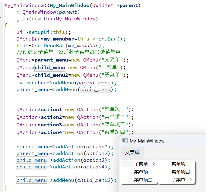 菜单栏->菜单->子菜单->菜单项这样的形式,而在 Qt 中,为菜单添加子菜单可通过 QMenu 的 addMenu() 函数实现,本质是在一个菜单中嵌套另一个菜单,形成层级结构。具体如下所示;