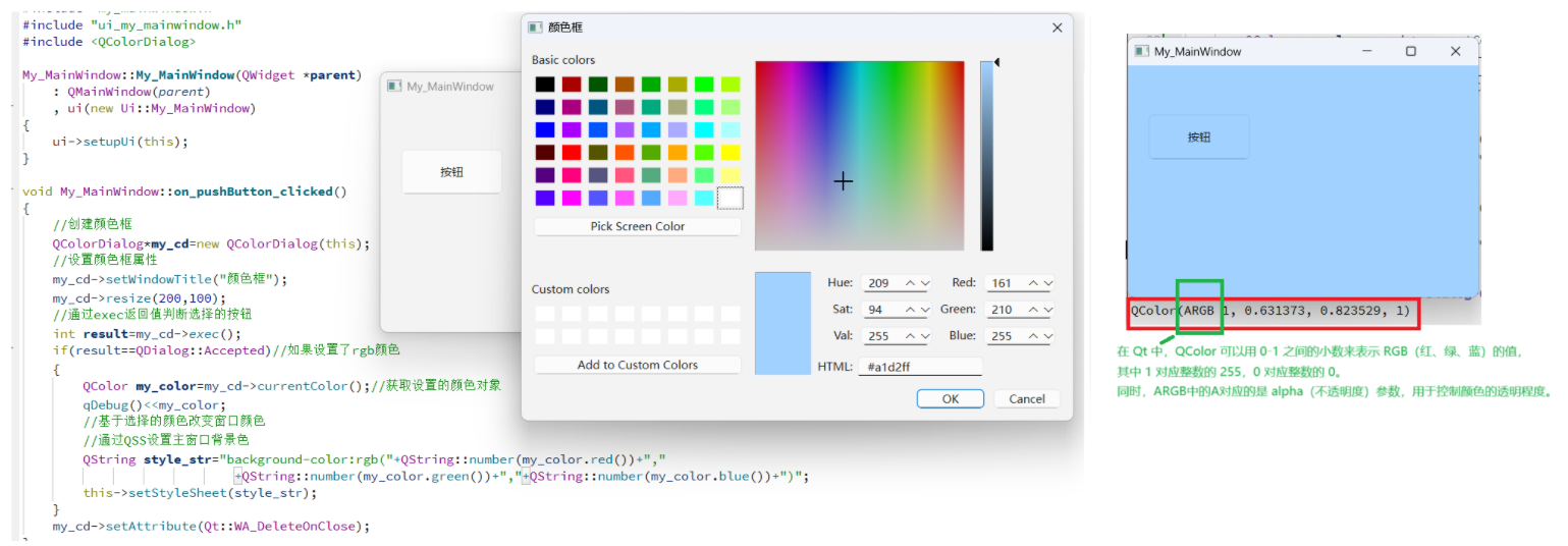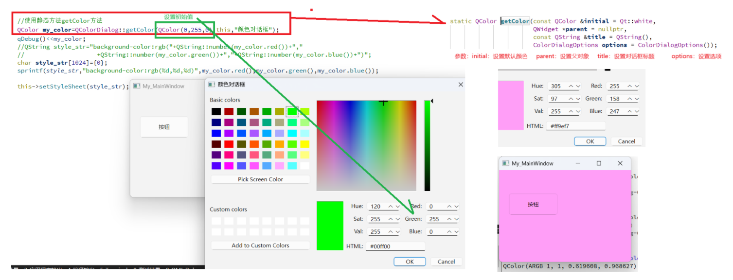 在 Qt 中使用 QColorDialog 非常简单,主要有两种方式:一种是通过实例化对象进行自定义配置,这种方式适合复杂需求,上面已做介绍;另一种是通过静态方法 getColor 快速调用,这种方式更推荐,适合简单场景。具体如下所示: