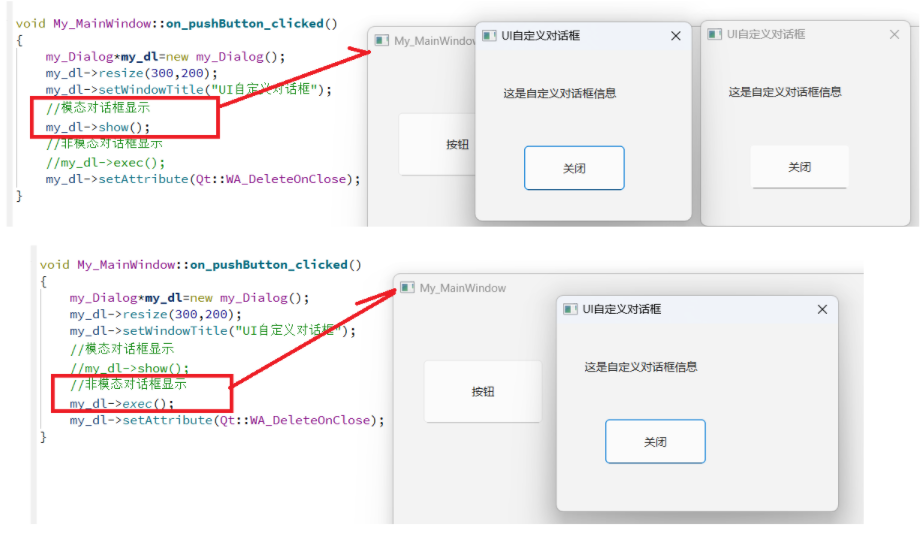 非模态对话框 显示后独立存在,是一种非阻塞式对话框,用户可以同时与它和父窗口进行交互,通过 **QDialog::show ()**函数调用。这类对话框一般在堆上创建,若创建在栈上,弹出后会一闪而过;同时需设置 Qt::WA_DeleteOnClose 属性,避免创建多个非模态对话框时出现内存泄漏。它适用于特殊功能设置的场合,比如查找操作、属性设置等,像调色板、参数设置面板这类工具面板常设计为非模态 ------ 用户可在调整对话框参数的同时,实时在主窗口查看效果,无需频繁关闭对话框再操作主窗口,提升了操作的灵活性和连续性。与模态对话框不同,非模态对话框不会强制用户优先处理自身,更适合需要长期悬浮、辅助主窗口操作的场景。我们上面的自定义对话框一直都是用非模态对话框实现的!具体如下所示: