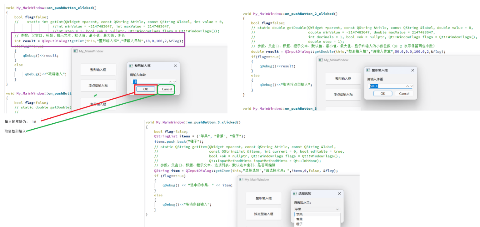 int result = QInputDialog::getInt(this,"整形输入框","请输入年龄",18,0,100,2,&flag);