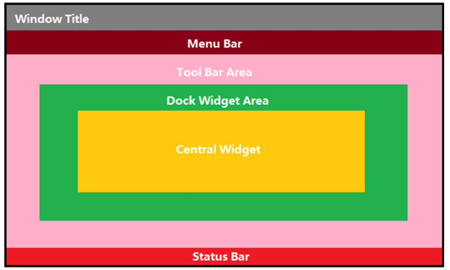 QMainWindow 是为用户提供主窗口程序的类,它继承自 QWidget 类,并且自带一个预定义布局。该类包含一个菜单栏(menu bar)、多个工具栏(tool bars)、多个浮动窗口(铆接部件,dock widgets)、一个状态栏(status bar)和一个中心部件(central widget),是文本编辑器、图片编辑器等众多应用程序的开发基础。如下图所示,为 QMainWindow 中各组件的具体位置。