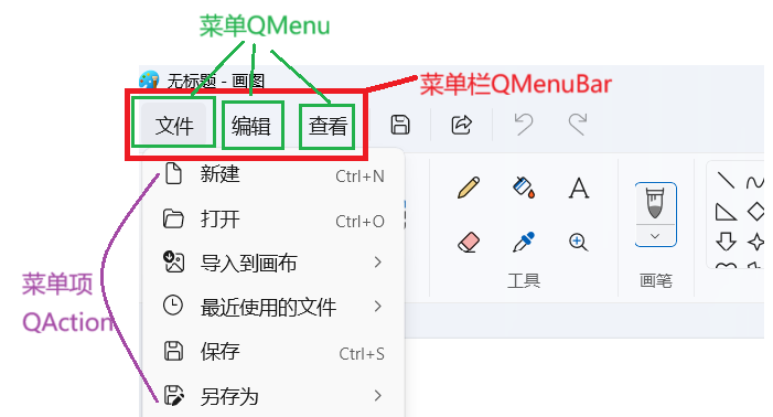 在 Qt 中,菜单栏(Menu Bar)是 QMainWindow 窗口的重要组成部分,由 QMenuBar 类实现,一个主窗口最多只能有一个,位于窗口顶部、标题栏下方。它是一组下拉菜单的集合,其中包含菜单,菜单下又有具体菜单项,用于组织和呈现应用程序的各类功能操作,方便用户快速访问和执行命令。例如文本编辑器类应用中,菜单栏通常有 "文件""编辑""格式""工具""帮助" 等菜单,每个菜单下包含 "新建""打开""保存""复制""粘贴" 等操作选项,让用户能直观、有条理地使用功能。具体如下所示: