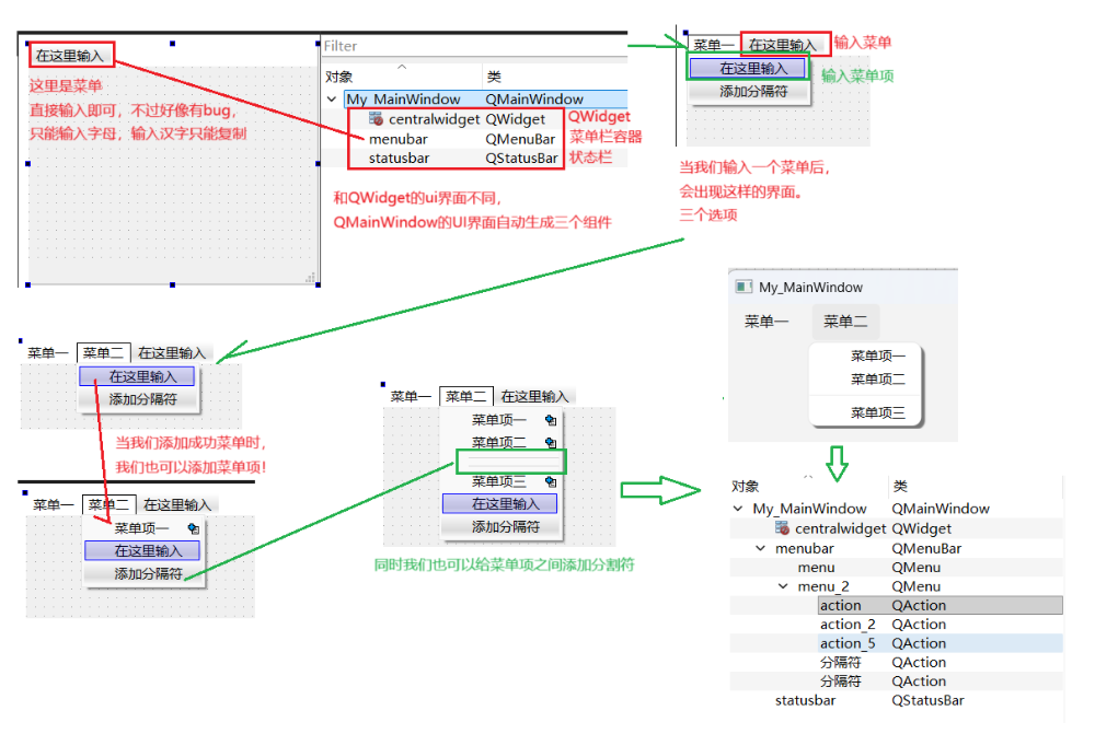 在可视化 UI 界面中创建菜单的方式,能帮助开发者快速构建具有层级结构的功能导航,是 Qt 界面开发中高效组织应用功能的常用手段。但这种方式也存在不足,比如只能输入字母而无法输入汉字,因此通过代码创建会更便于我们控制。接下来将通过代码进行创建,具体如下所示: