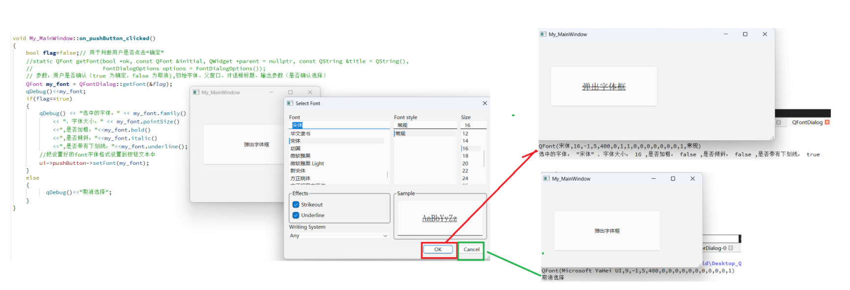 它与 QColorDialog、QFileDialog 类似,QFontDialog 也支持静态方法快速调用和实例化对象自定义配置两种使用方式。这里我还是使用静态方法快速调用的方式展示字体对话框,具体如下所示: