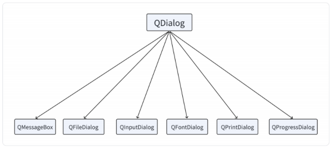 Qt 提供了多种可复用的对话框类型,即 Qt 标准对话框。这些标准对话框均继承自 QDialog 类,常用的标准对话框如下: