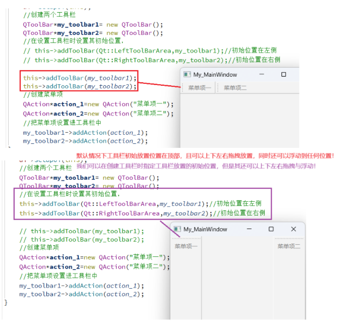 前面我们提到,工具栏可通过拖拽改变停靠或浮动位置,而其停靠位置的设置有两种方式:一种是在创建工具栏时直接指定,另一种是通过 QToolBar 类的 setAllowedAreas () 函数进行设置。