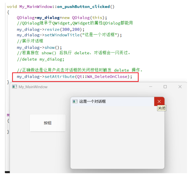 在处理 QDialog 的内存释放时,若直接在 show() 后执行 delete,对话框会一闪而过。正确做法是让用户点击对话框的关闭按钮时触发 delete 操作。Qt 提供了便捷的属性设置方式,通过 dialog->setAttribute(Qt::WA_DeleteOnClose),可使对话框在关闭时自动执行 delete 操作,避免内存泄漏,简化了内存管理流程。